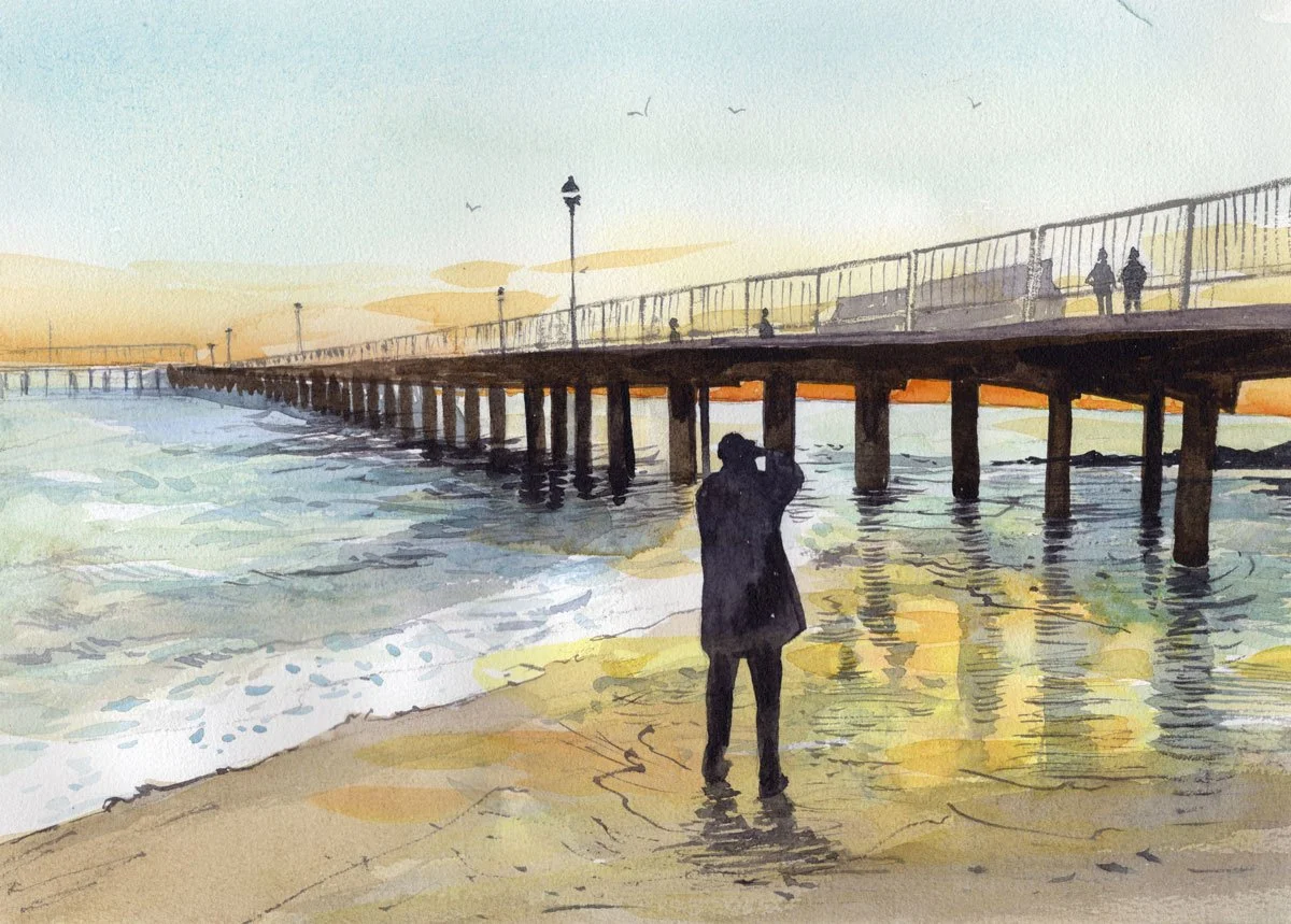 Photographer on the beach by a pier